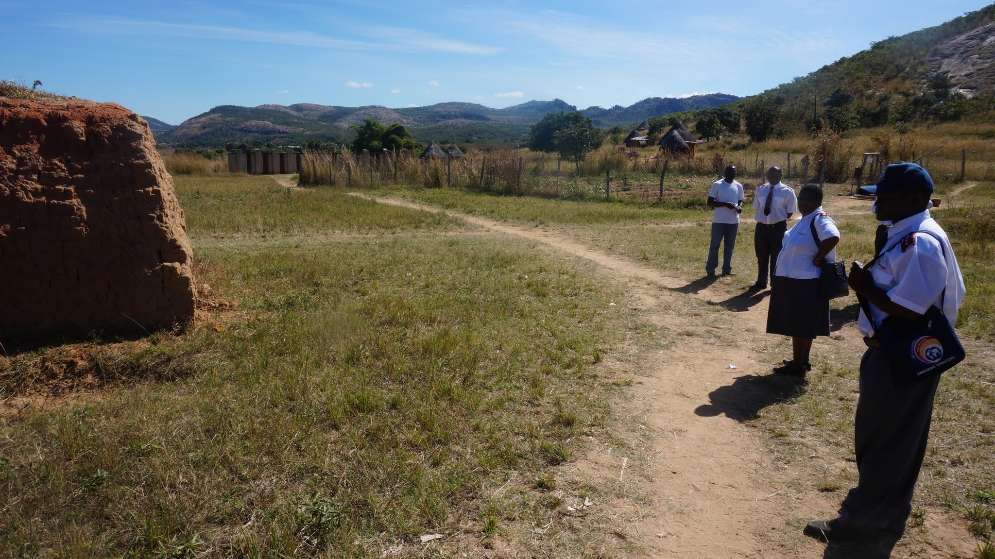 Captain Jarai, Major Pamacheche and the DC inspecting the brick stack. Behind them is the vegetable patch which has been fenced to keep out the animals. Maodzwa, may 2014