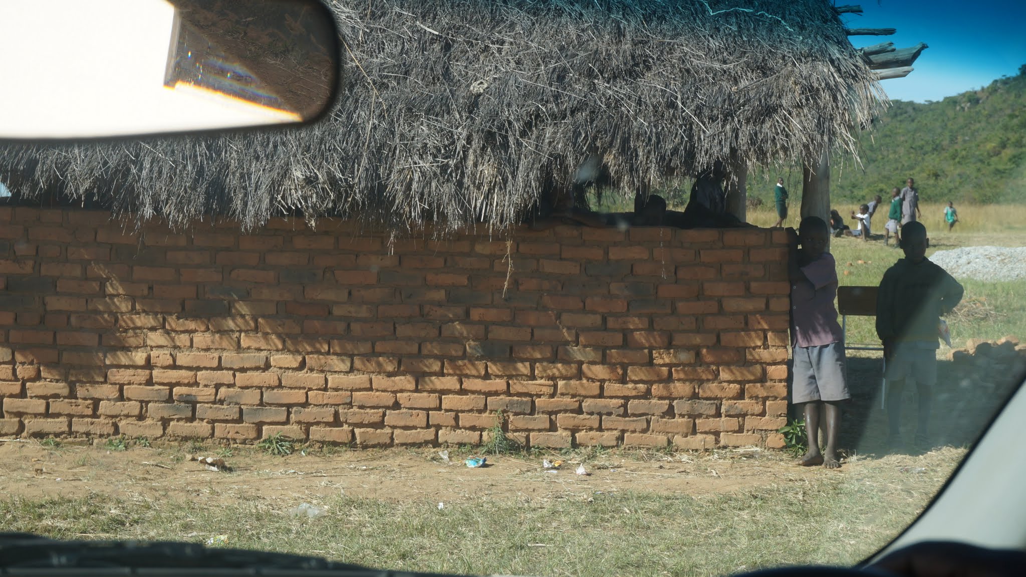 Leaving Maodzwa, watched by curious students. May 2014
